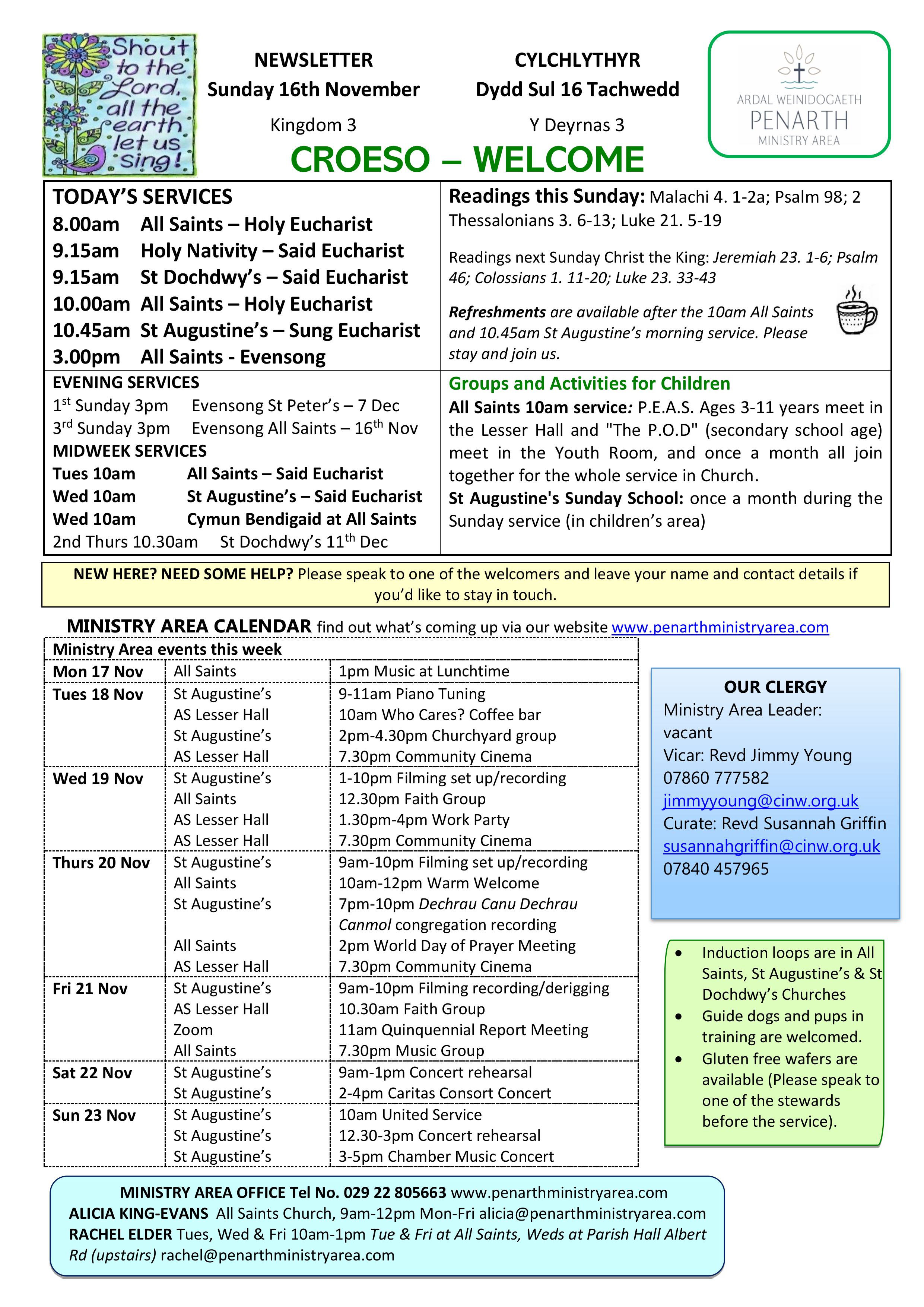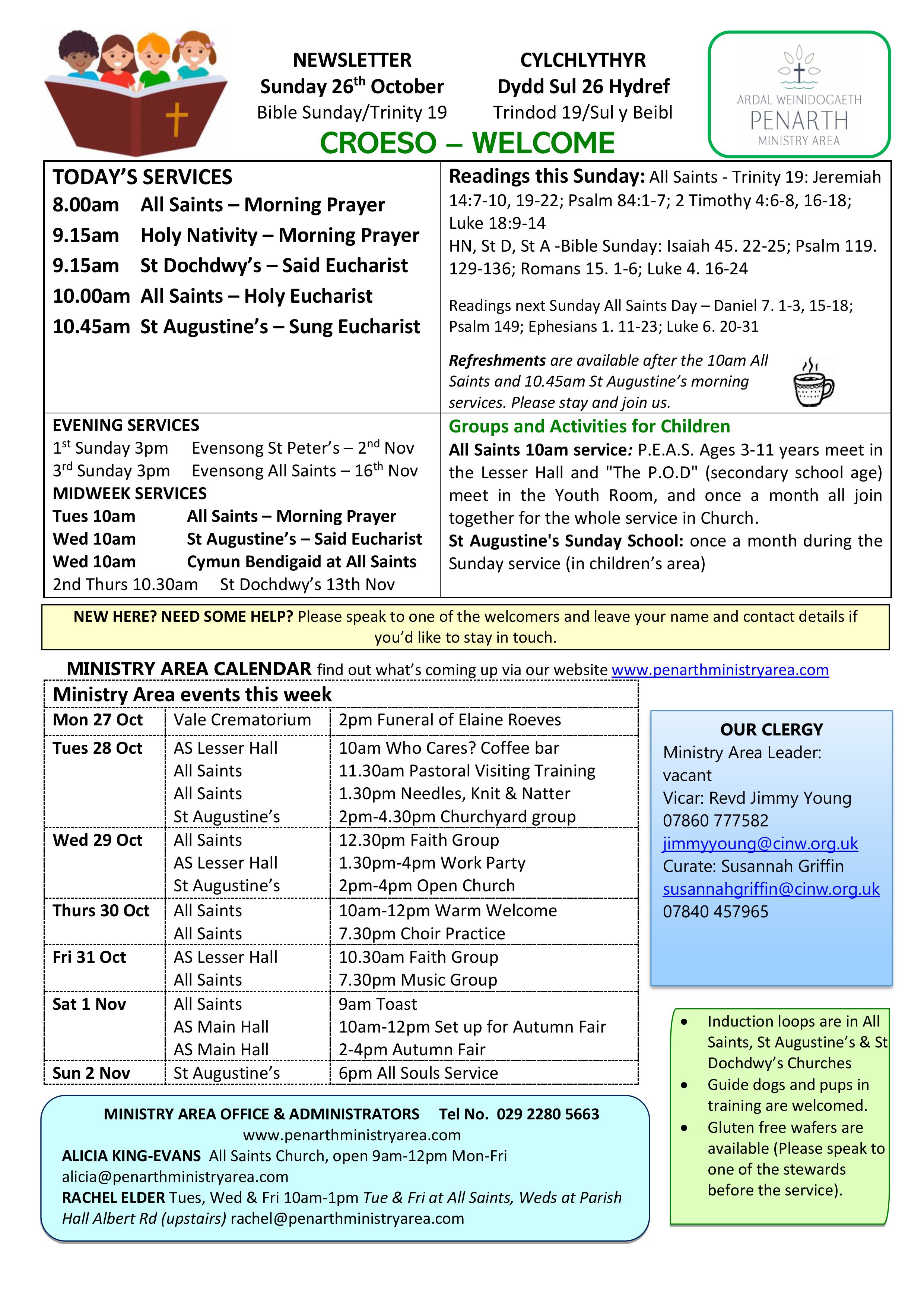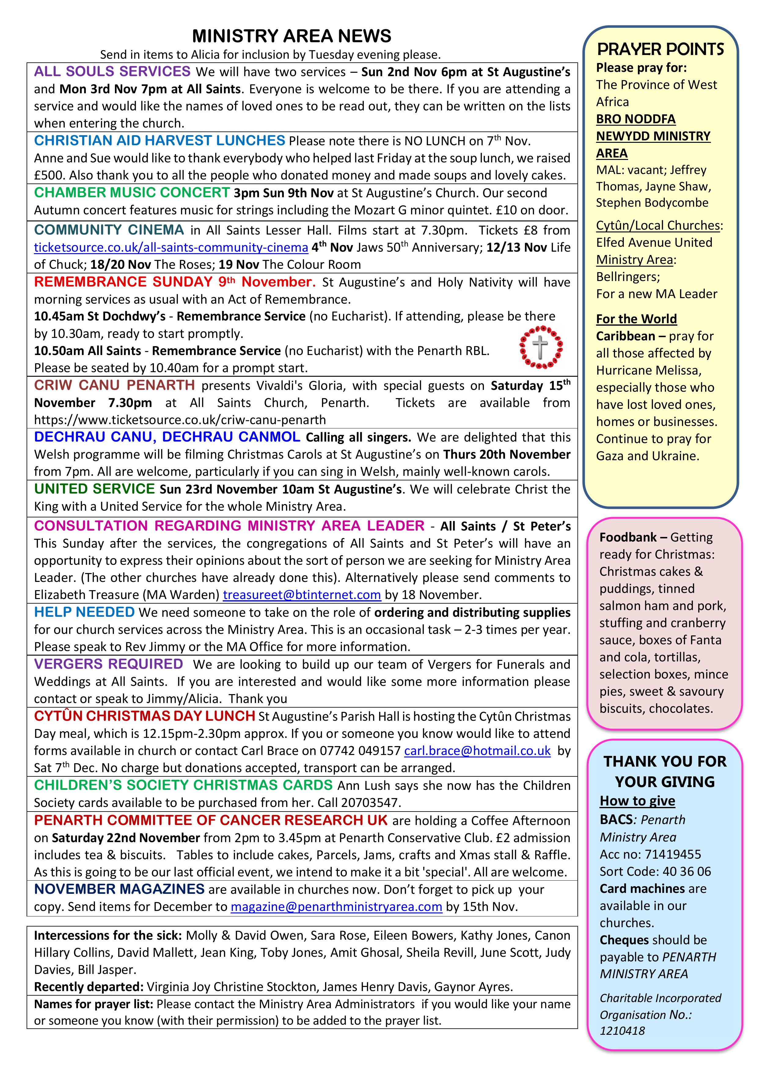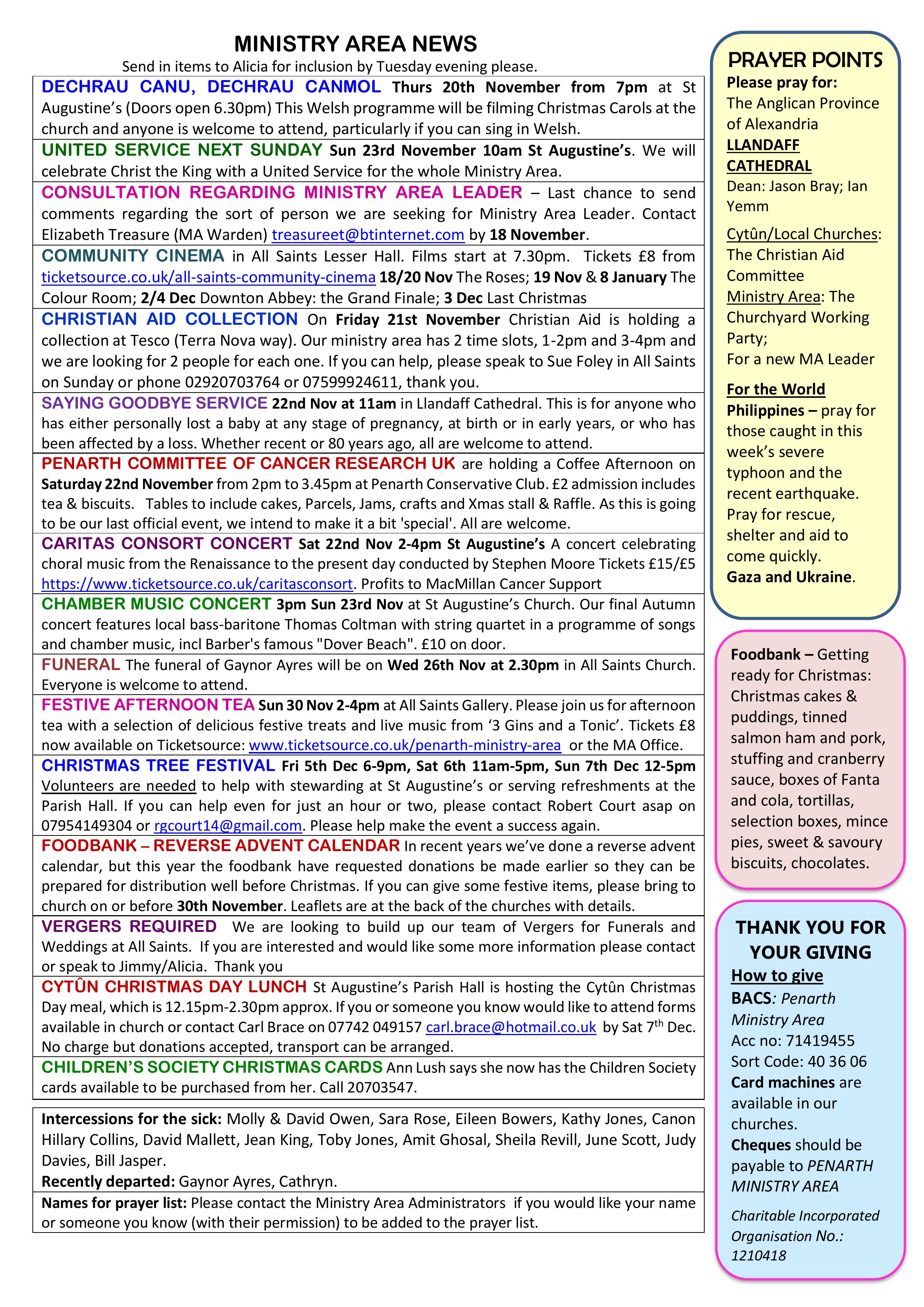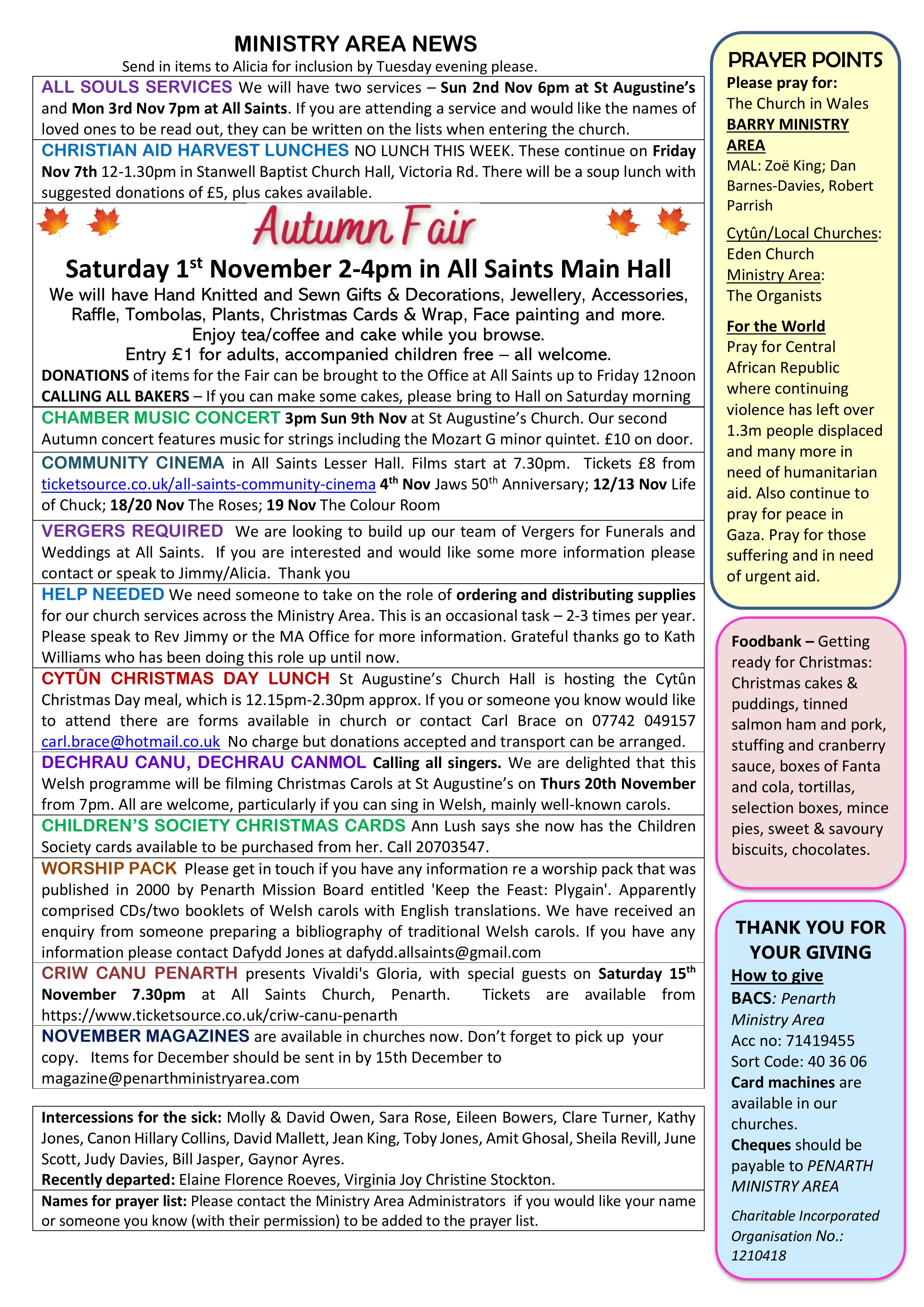 HARVEST UNITED SERVICE Sun 28th Sept 10am at All Saints Church. The whole Ministry Area is invited to come together to celebrate Harvest with a United Service. (No other services that day). This will be followed by: HARVEST BUFFET LUNCH 12.30pm in All Saints Main Hall. Tickets are £12 adults, £6 children and can be booked through Ticketsource or call the Office to reserve your place. https://www.ticketsource.co.uk/penarth-ministry-area/t-krvqagg